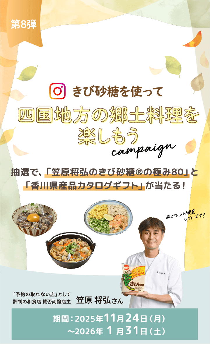 きび砂糖を使って四国地方の郷土料理を楽しもうcampaign 抽選で、「笠原将弘のきび砂糖®の極み80」と「香川県産品カタログギフト」が当たる! 「予約の取れない店」として評判の和食店 賛否両論 店主笠原 将弘さん 期間:2026年11月24日(月)〜2026年1月31日(土)